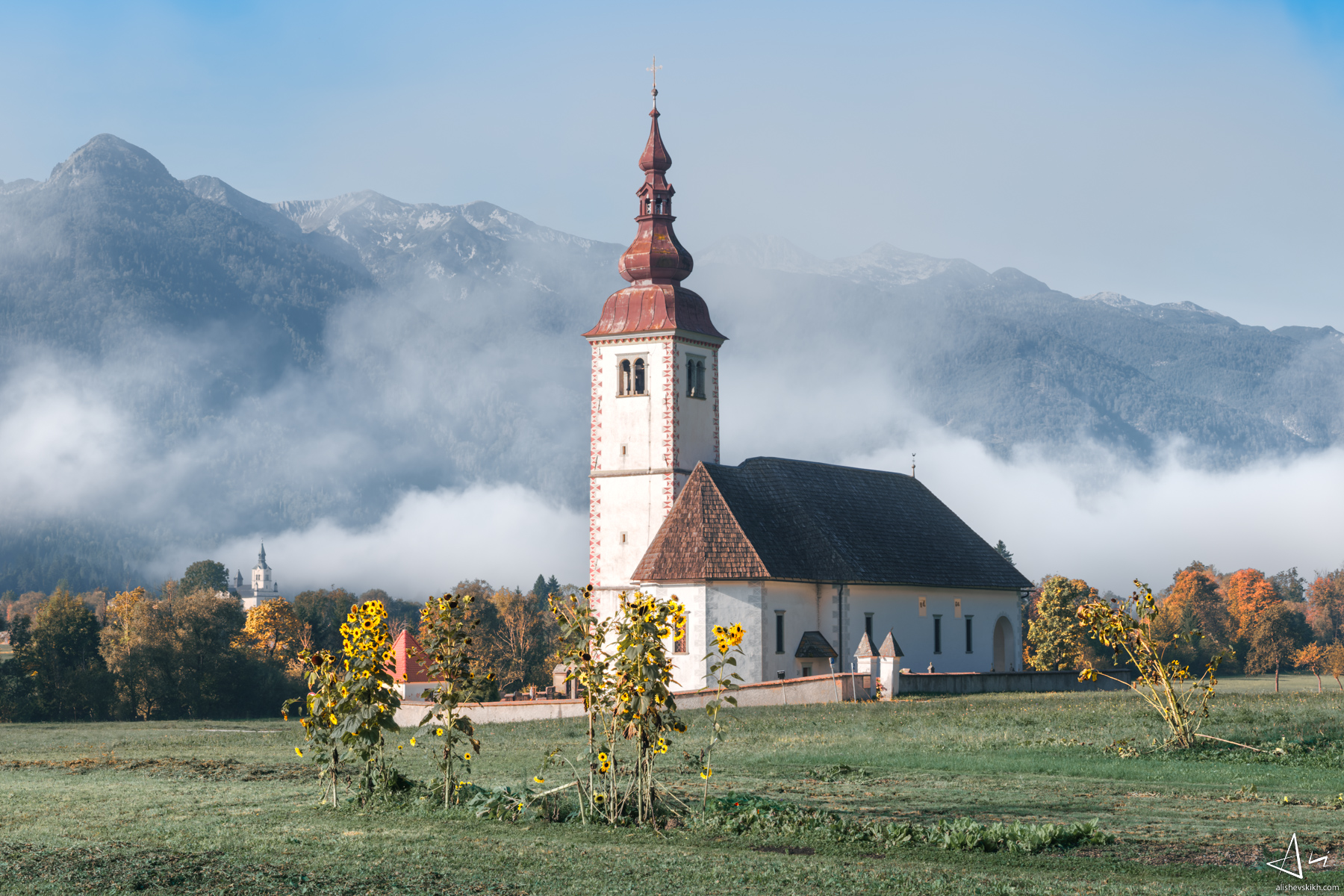 Our Lady of the Rosary Fujifilm X-T5 + XF 16–80mm/f4 @38mm1/280s · f8 · ISO 125 Our Lady of the Rosary Church (Cerkev Rožnovenske Matere Božje), Bohinjska Bistrica, Slovenia Related Buy a high resolution version of this photo licensed for commercial use or subscribe to my Patreon for all licensed Gallery photos and other exclusive content. Become a patron November 05, 2025 Featured Photos , Slovenia architecture , autumn , church , fog , historical , landscape , mountains , Slovenia , sunflowers ⚲ Location on map